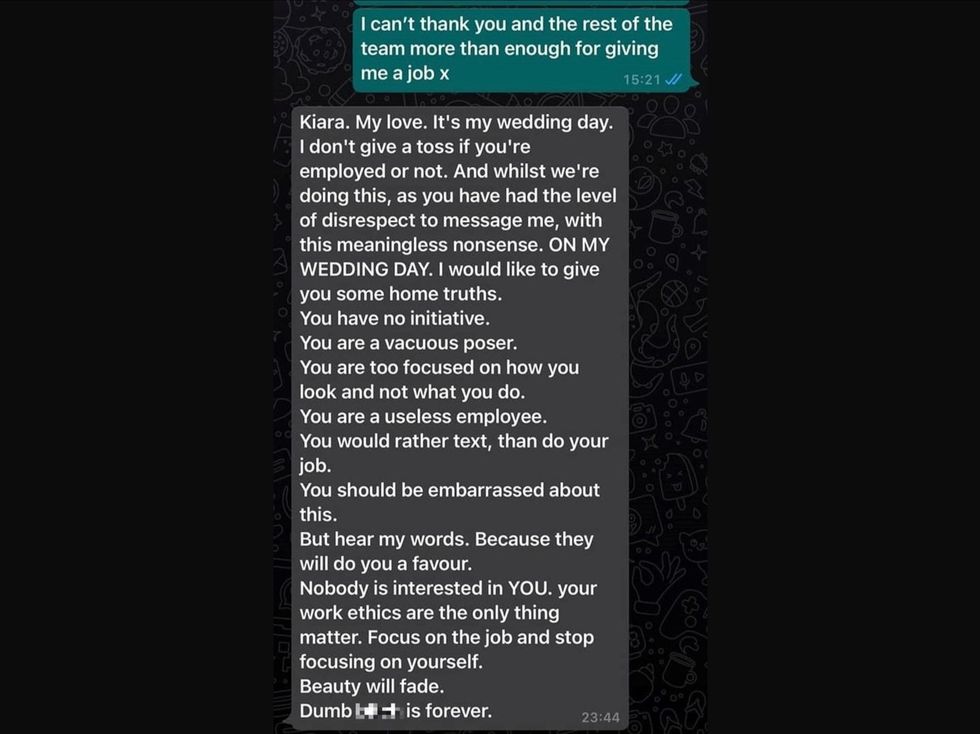 According to a screen grab shared with local media, the biting reply read: “Kiara. My love. It’s my wedding day. I don’t give a toss if you’re employed or not.