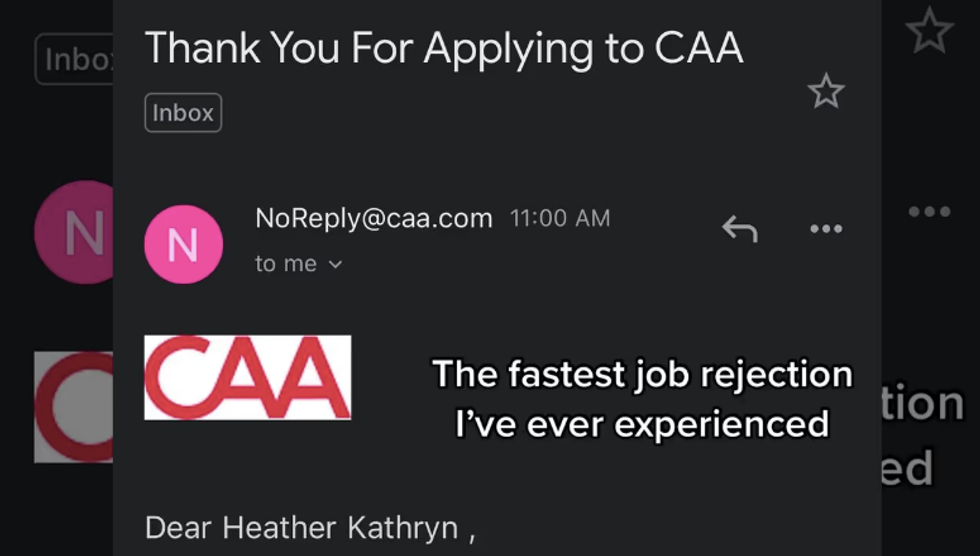 The rejection stated: “Dear Heather Kathryn, we appreciate your interest in CAA and the time you have invested in applying for Assistant – Music Touring.