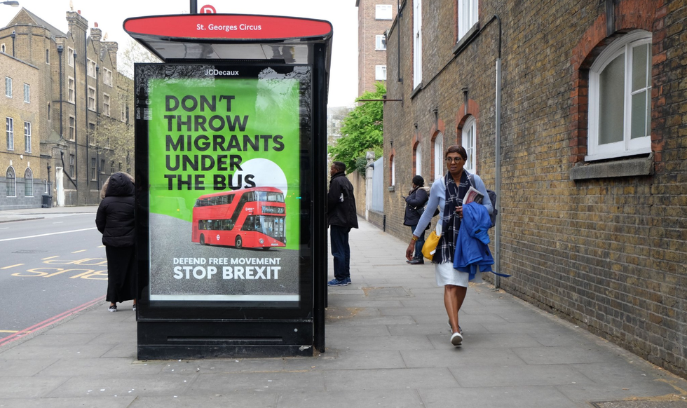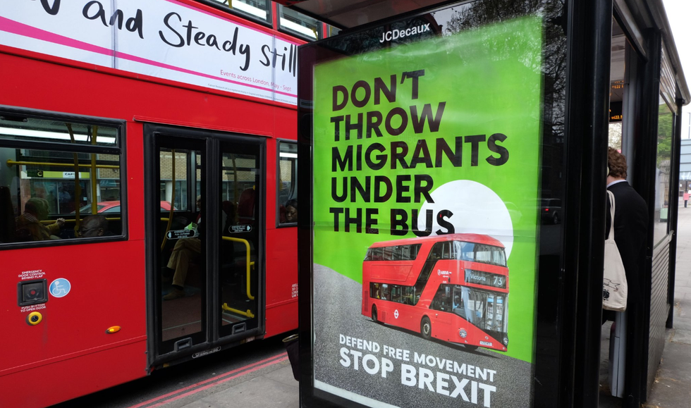 Another advert at a bus stop has the words “Don’t throw migrants under the bus” written on it, below which is a photo of a double decker bus.