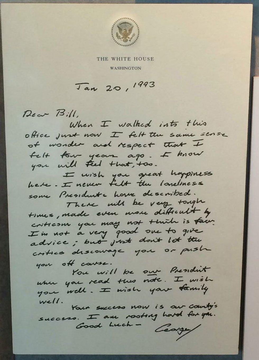 He succeeded George H W Bush after a four year term in the office and was greeted by a handover note from the former President, as is customary.