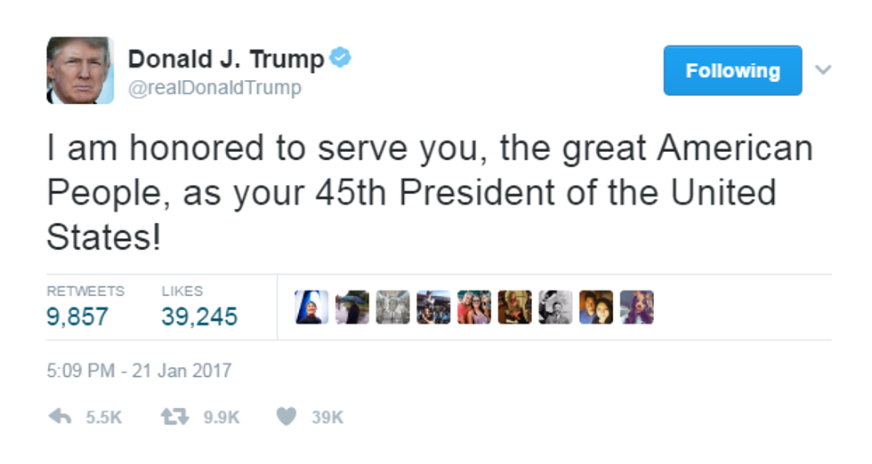 The Commander in Chief was at it again this afternoon, taking to the micro-blogging site to tell "The great American People" how honoured he was to serve as their 45th President.