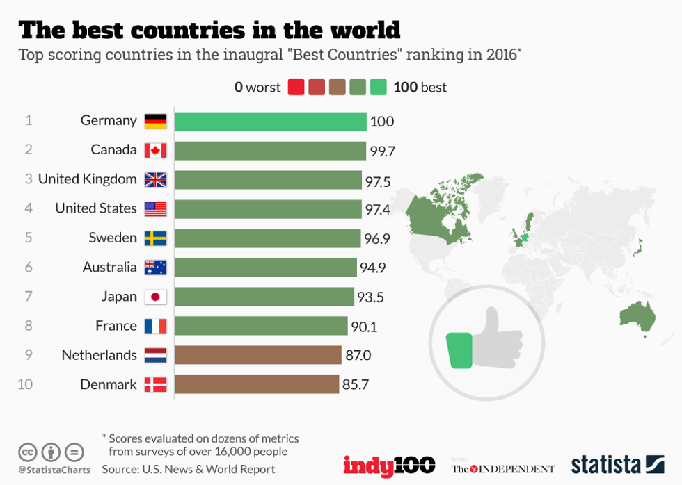 Germany took the top spot in the inaugural rankings by the US News & World Report in collaboration with the University of Pennsylvania's Wharton School and BAV Consulting. The survey asked more than 16,000 worldwide respondents' perceptions of countries.