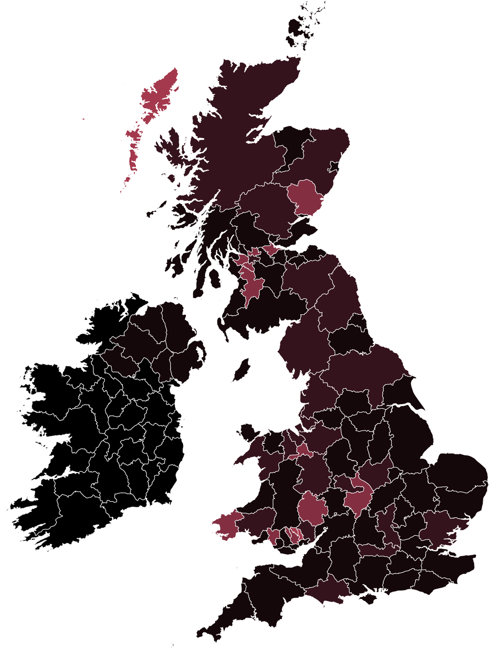 Here's an overview of the tweets broken down by regional location - the brightest red areas display more insensitive language, darker areas have more debate and less insensitive language:
