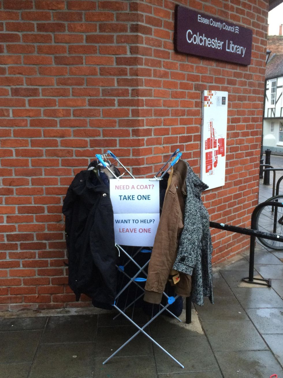 Armed with a plastic clothes line and a few old coats, she set them up in front of Colchester Library with a sign: