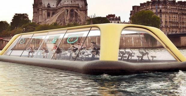 The Paris Navigating Gym will be powered down the Seine River by human energy, as people exercise.