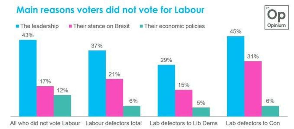 According to newly released data from polling company Opinium, 43 per cent of people who didn't vote Labour said that the leadership was the primary reason. This is compared to just 17 per cent who cited Labour's Brexit stance and 12 per cent who suggested the party's economic policies put them off.