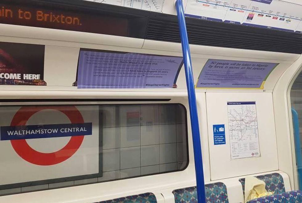Hundreds of adverts on the London Underground have been taken over by activists protesting the mass deportation of asylum-seekers on chartered private planes.