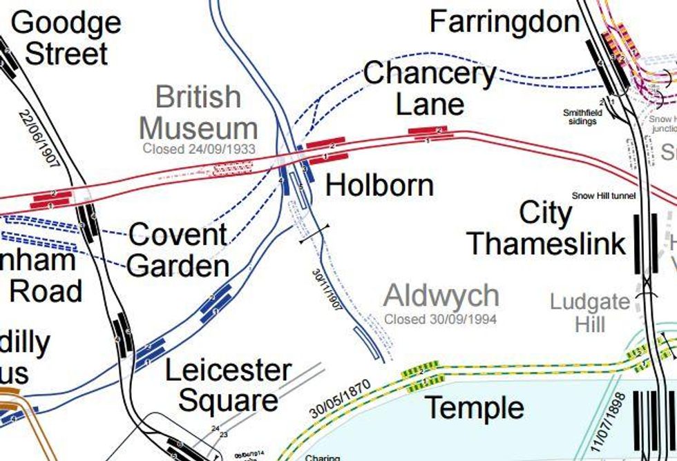 The map shows a number of tube stations that once existed on the tube, or ones which were never opened despite being built.