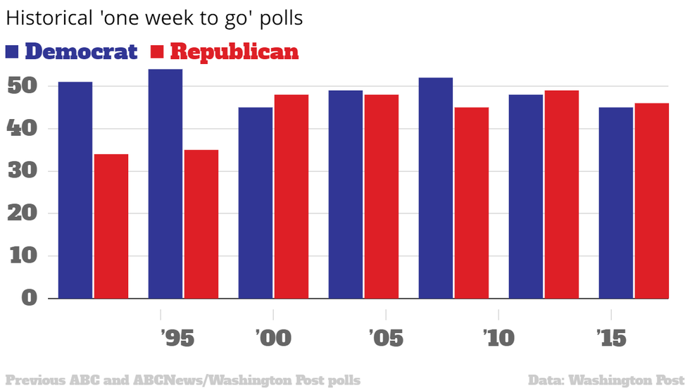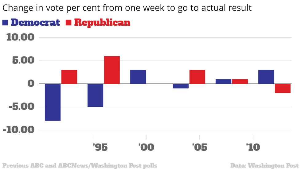 It's certainly true that over the course of six previous elections, the poll a week out has predicted two results incorrectly.