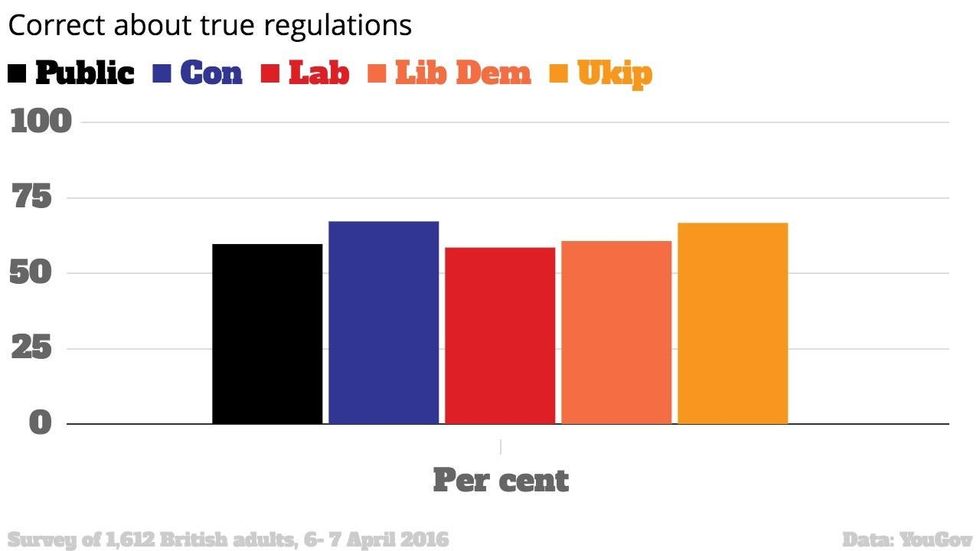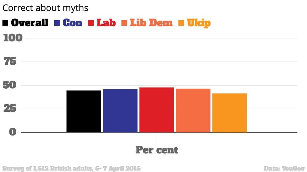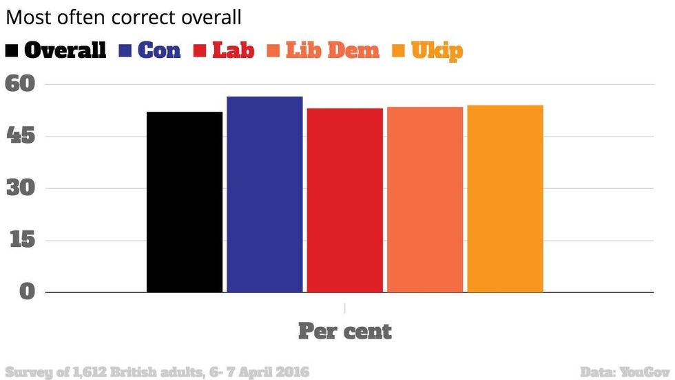 Overall, supporters of the Conservatives were most likely to pick the correct answer (56 per cent of the time), followed by Ukip (54 per cent), the Lib Dems (53.5 per cent) and lastly by Labour (53 per cent).