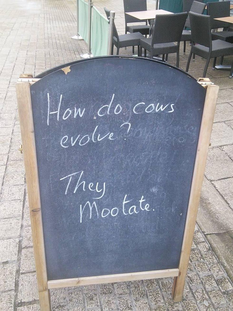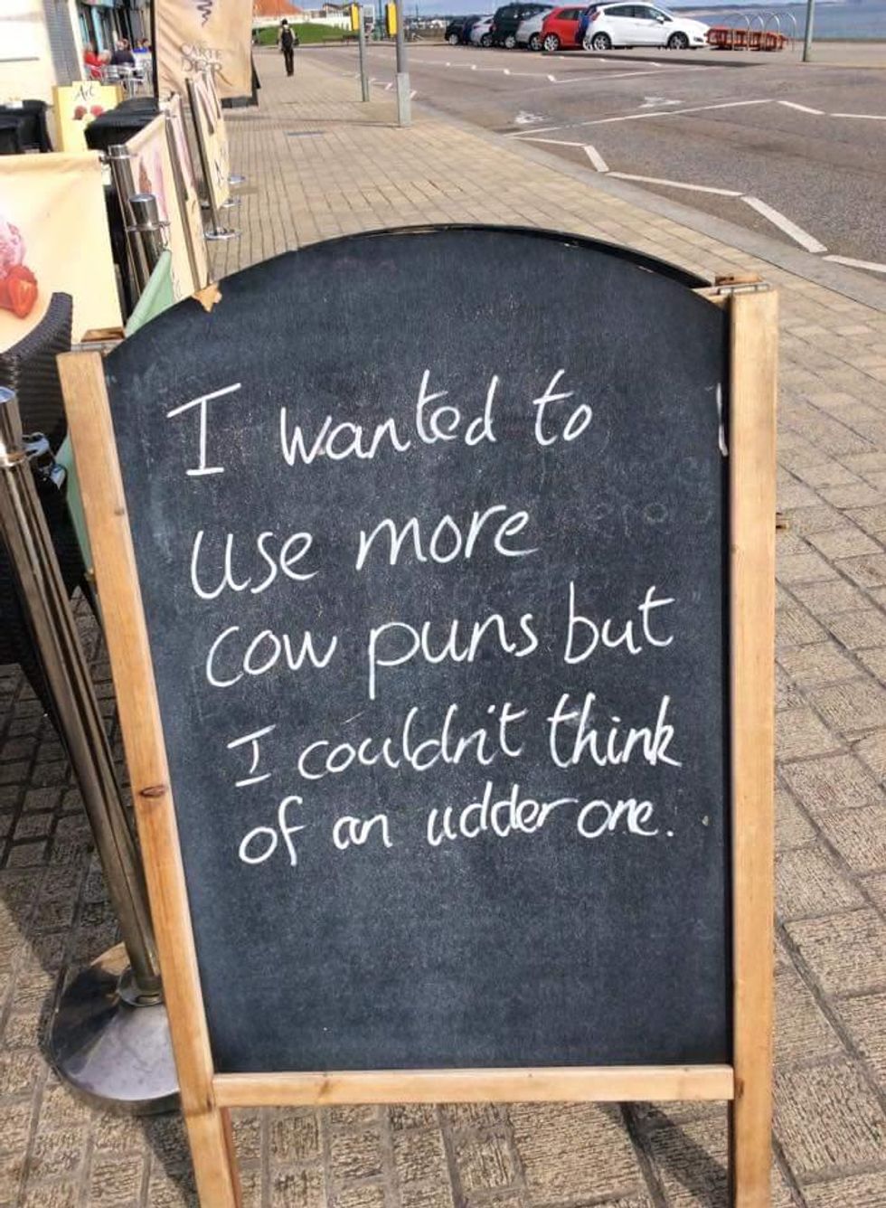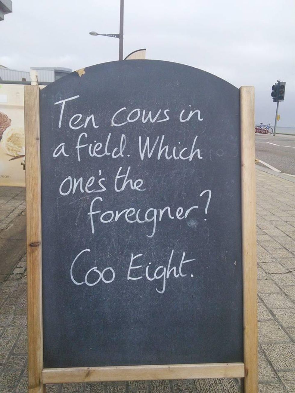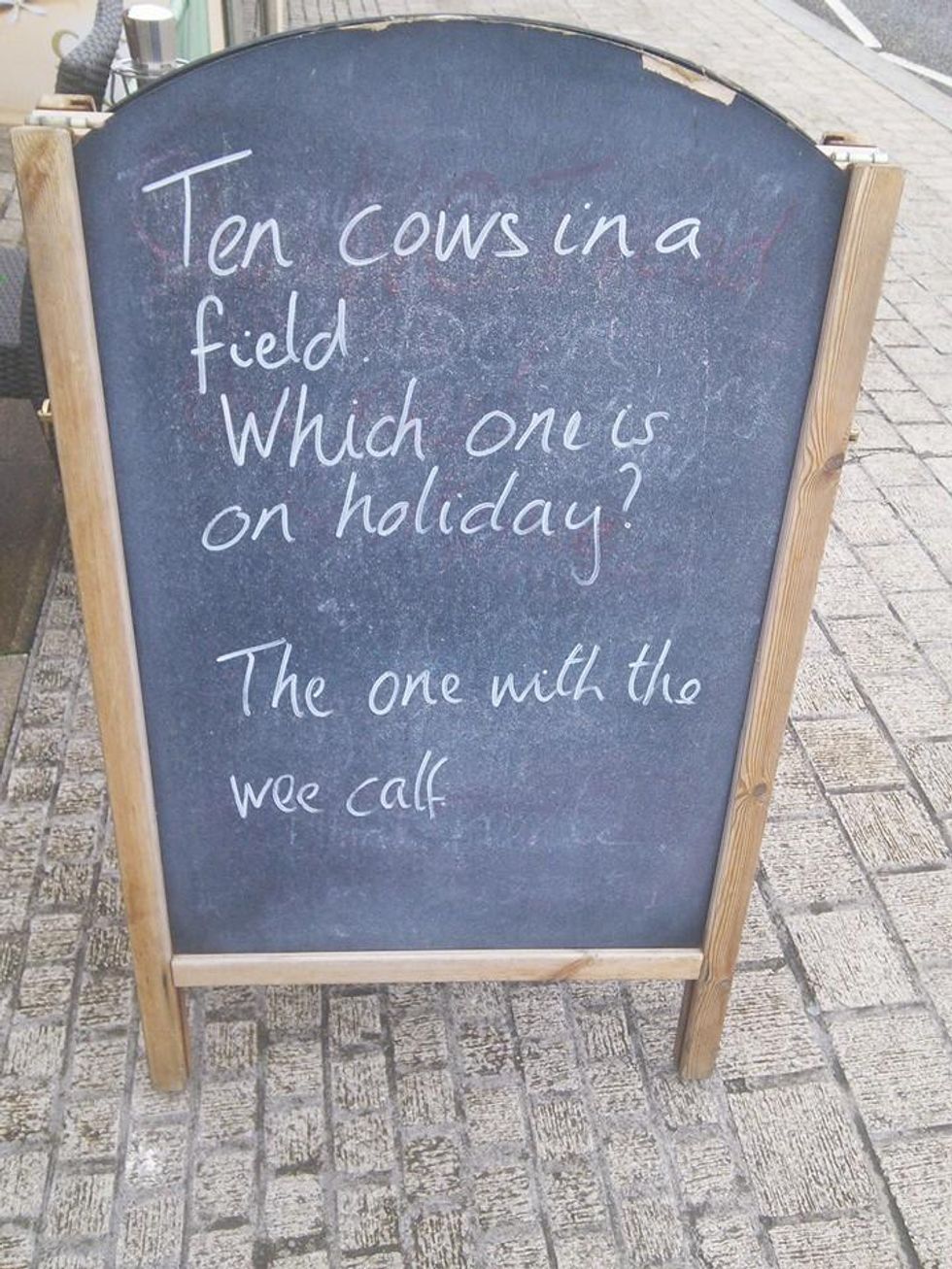 The whole series of ‘cow’ puns which rely on knowing that people around here will talk about a ‘wee calf’ or a ‘week aff’.