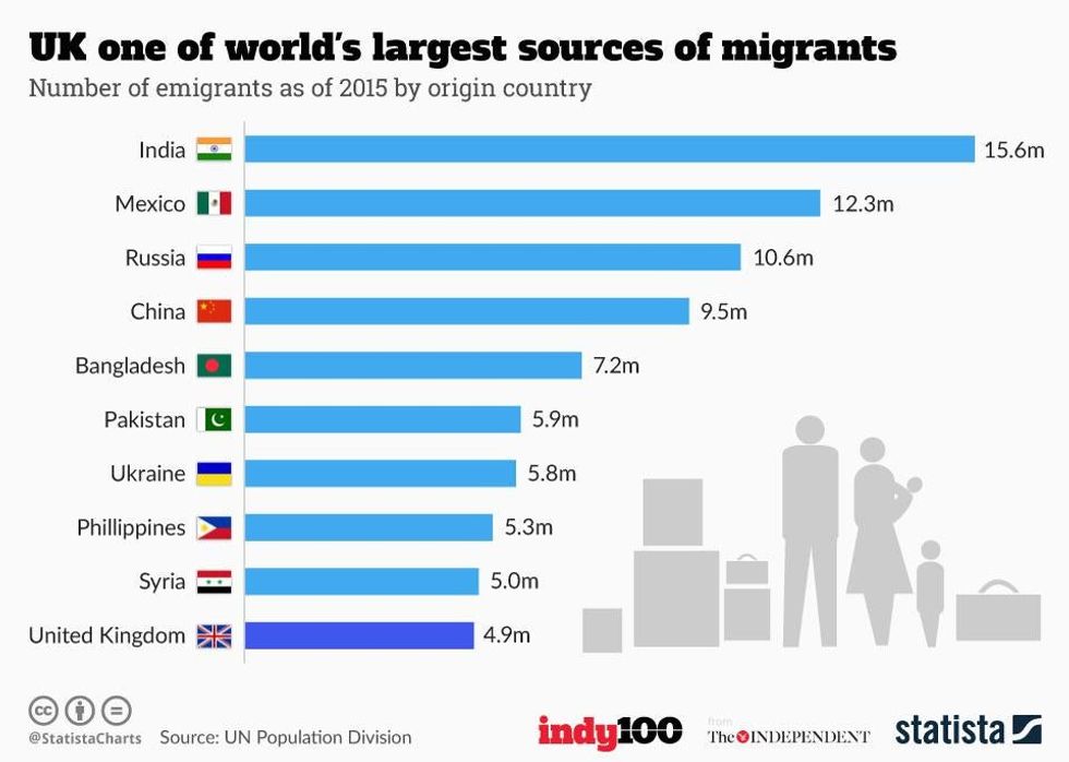 The UK was the 10th largest source of migrants in 2015 and the top ranked EU country.