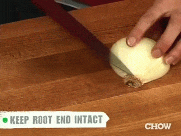 Peel the onion leaving the root intact, then make evenly spaced cuts. Like so: