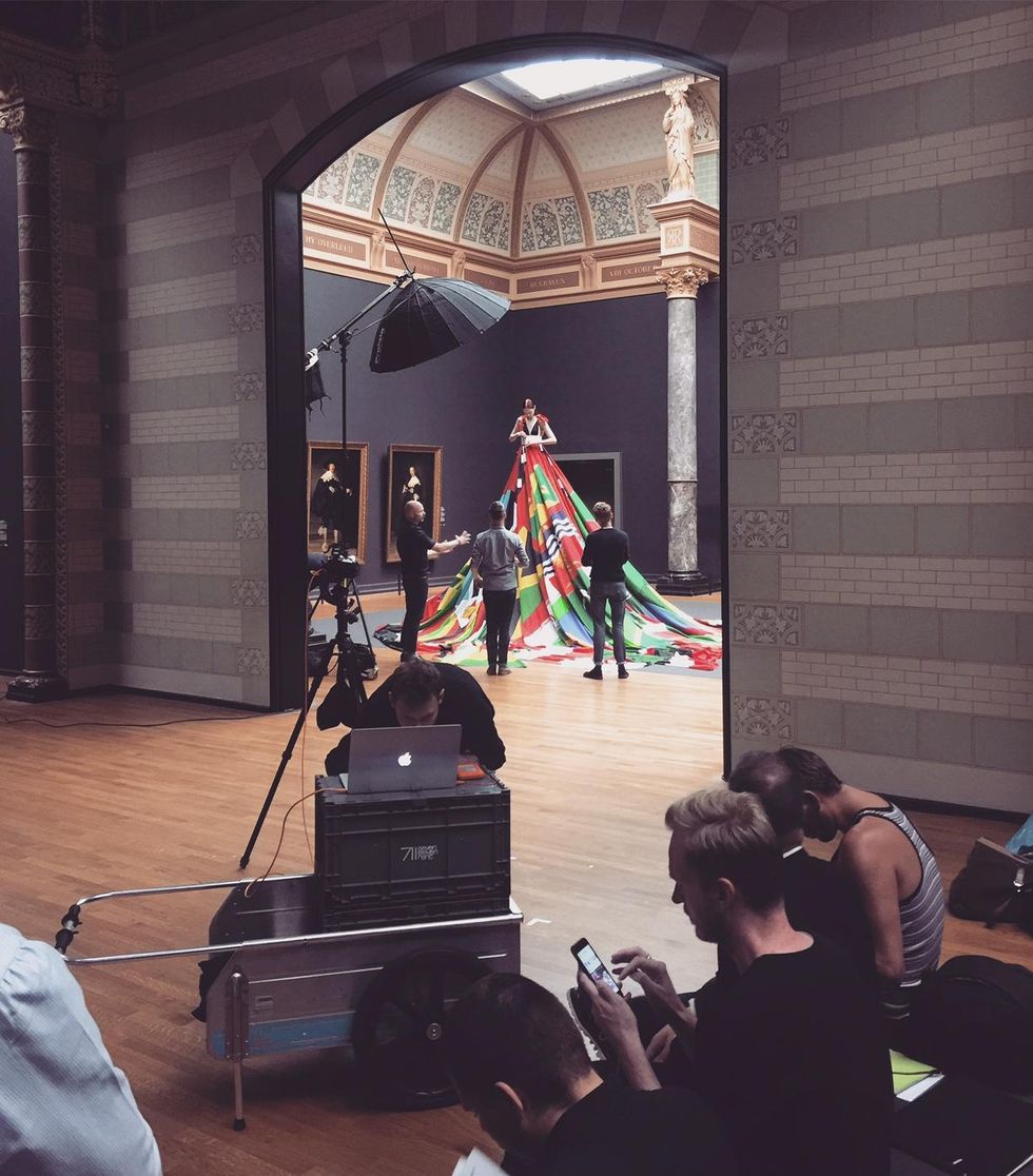 The shoot took place in Amsterdam's presitigious Rijksmuseum, in front of the Rembrandt painting commonly known as the Night Watch (1642).