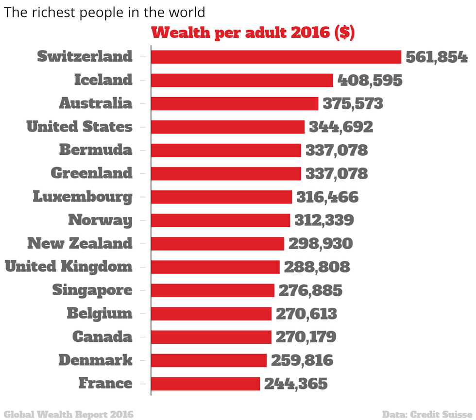 The Swiss are the richest people in the world by a margin, while people in the UK are the 10th wealthiest in the world.