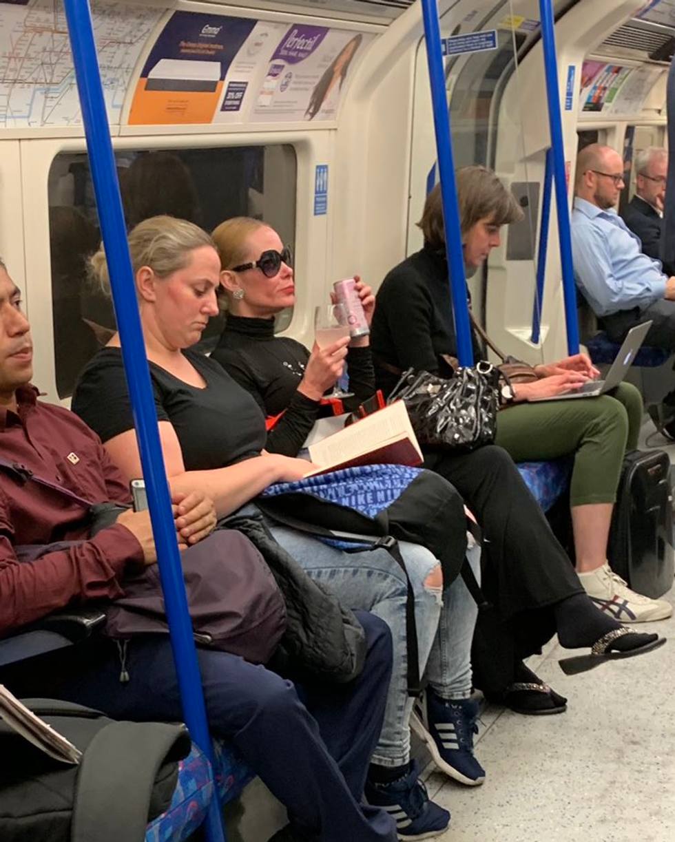 The woman has a can of gin in one hand, a glass in the other and is sat on the Northern line wearing dark sunglasses and a black ensemble, reactions to her photo have been favourable, with people hailing her a “hero” for her.