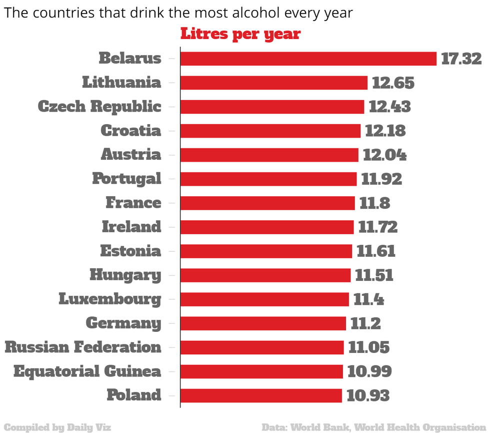 Belarusians are the heaviest drinkers in the world, while North Africans barely touch a drop.