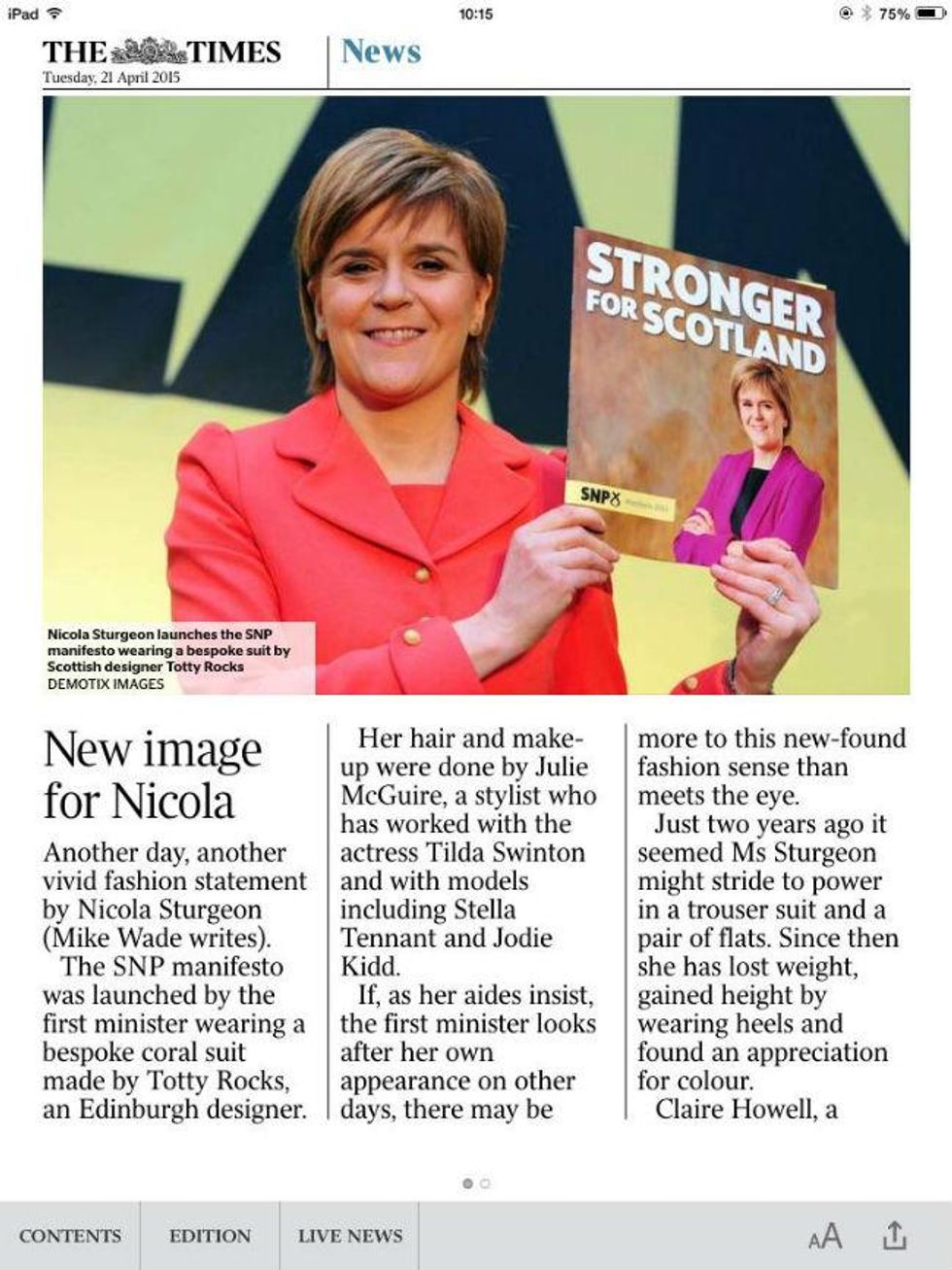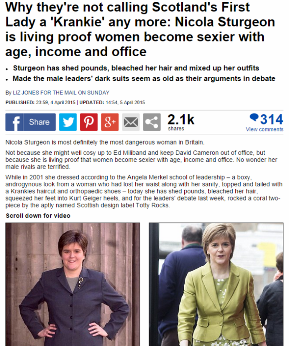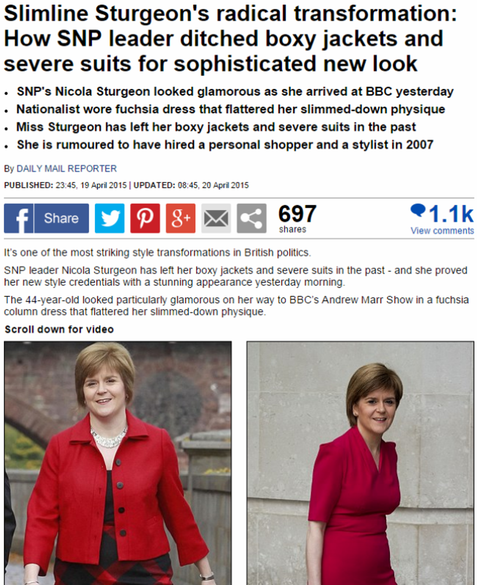 The Mail Online ignored her politics altogether in favour of how she dresses. First, they analysed Sturgeon's"radical transformation":
