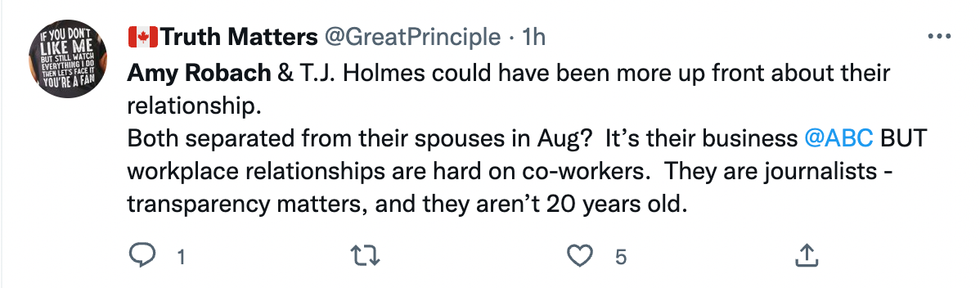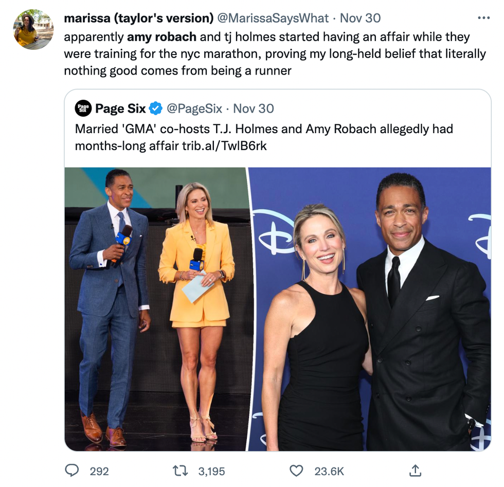 A representative for Robach and Holmes told the New York Times last week, "they had been close friends for many years but this relationship started over the past few months, after they separated from their respective spouses in August. They had not told anyone, even at ABC, because they were waiting until they both were divorced.”