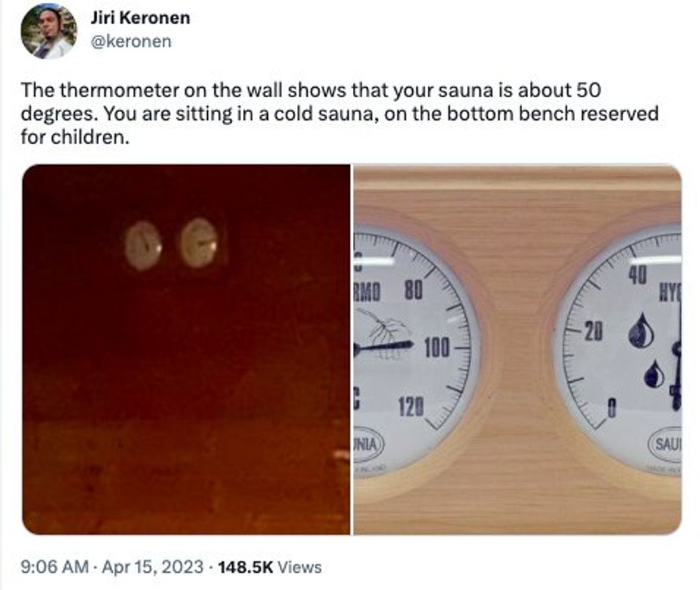 However, sharp-eyed sauna experts zoomed in on the sauna thermometer.