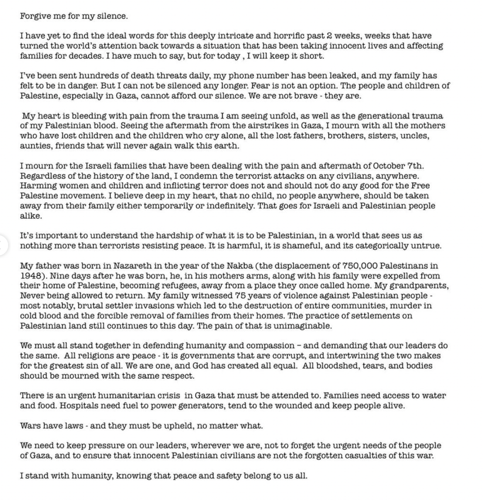 The model, of Dutch and Palestinian descent, continued: "I mourn with all the mothers who have lost children and the children who cry alone, all the lost fathers, brothers, sisters, uncles, aunties, friends that will never again walk this earth."
