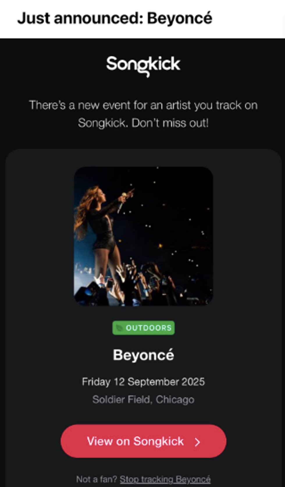 That's because concert discovery service Songkick (owned by Warner Music Group) appeared to send out notifications to fans about a Beyoncé concert date, as the notification claimed the music icon will take to the stage at Chicago’s Soldier Stadium on September 12, later this year.