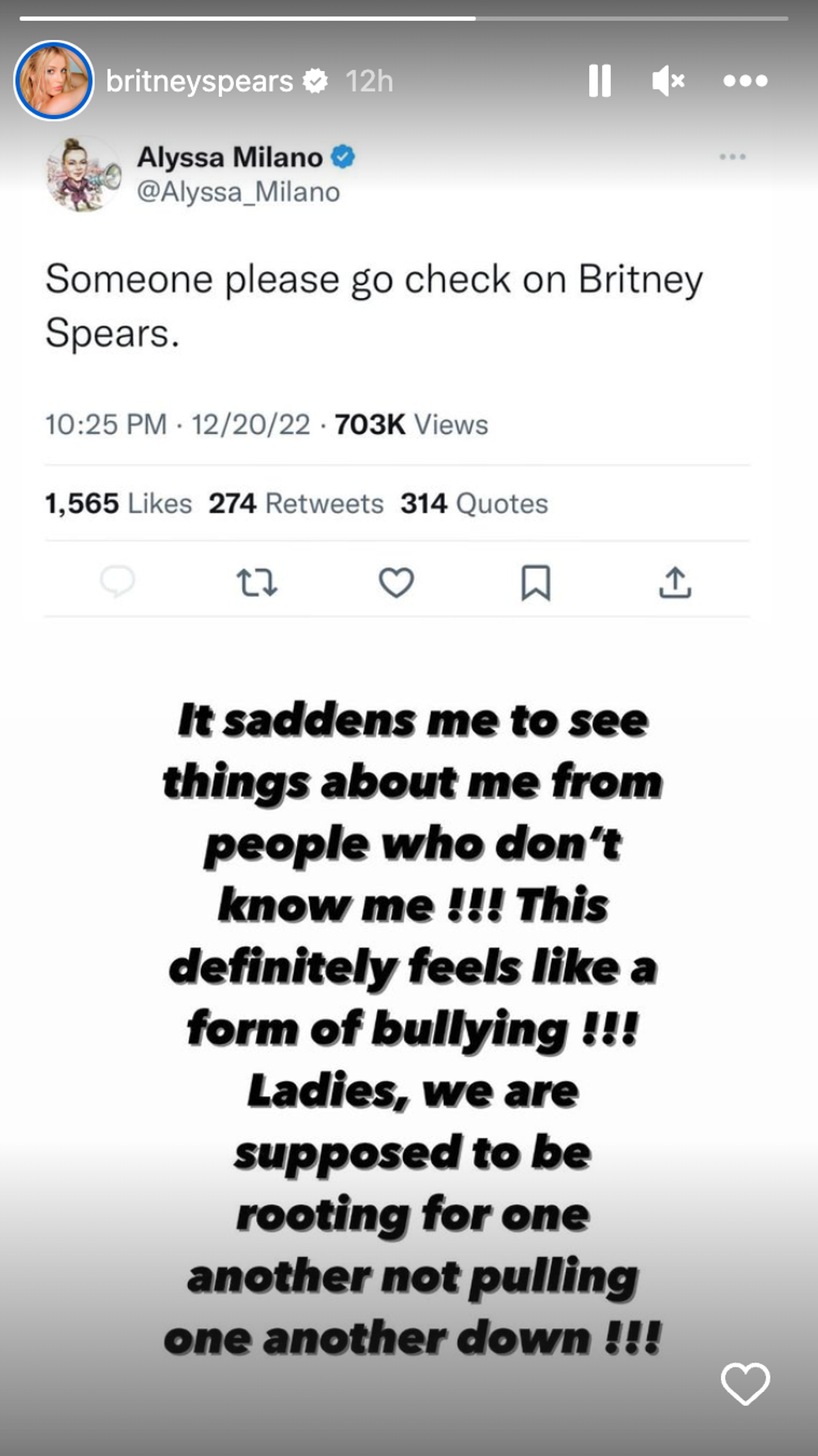 Although the tweet has gone a month without being noticed by Spears, the pop star posted it to her Instagram Story on Wednesday and called out Milano for bullying.