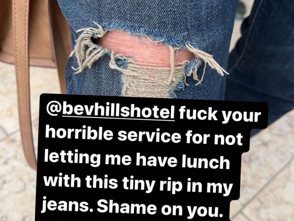 “F*** your horrible service for not letting me have lunch with this tiny rip in my jeans. “Shame on you. Disgusting. I have been a patron for decades. No longer,” the reality star captioned a picture that showed her jeans with the small rip.
