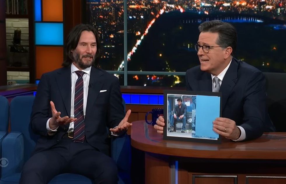 "I'm just eating a sandwich, man!" he explained to which Colbert asked, "So, you're not actually sad in 'Sad Keanu'?"