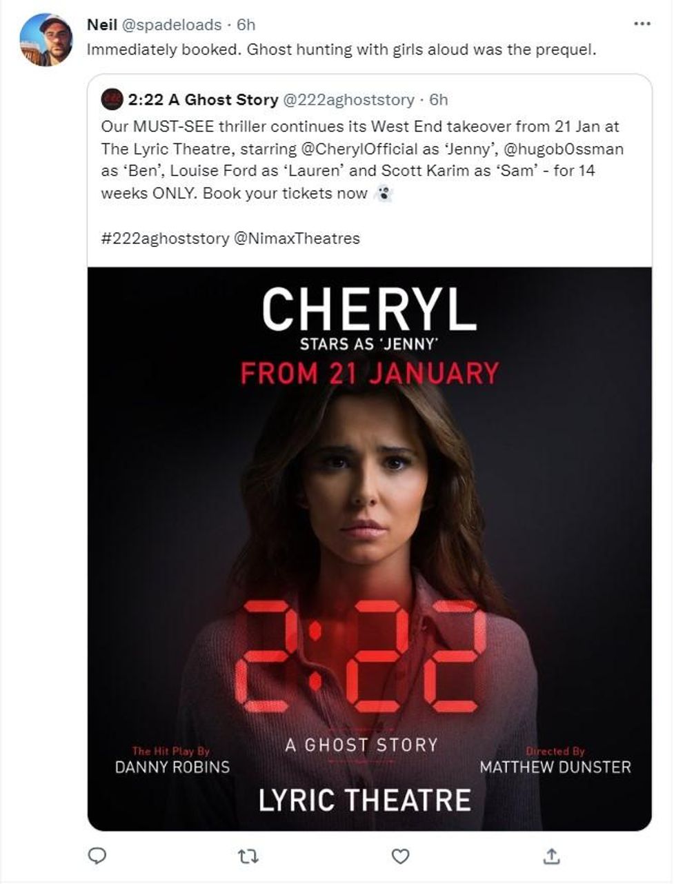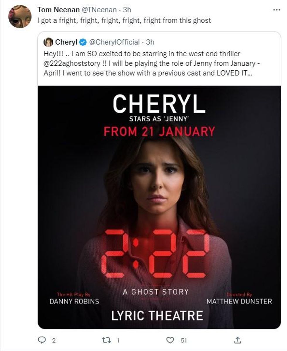 Fans will be able to see Cheryl in 2:22 A Ghost Story from January to April 23 at the Lyric Theatre.