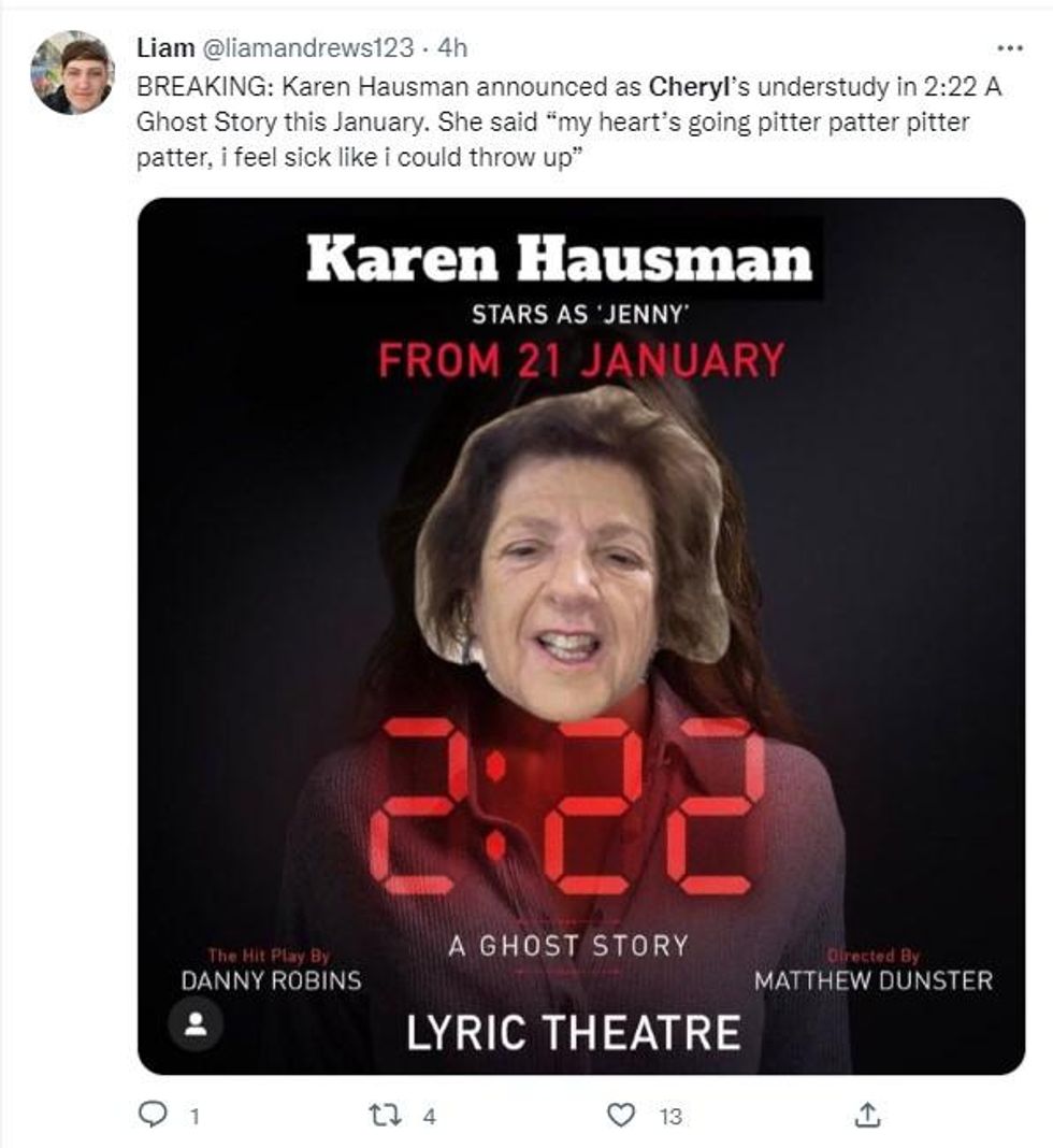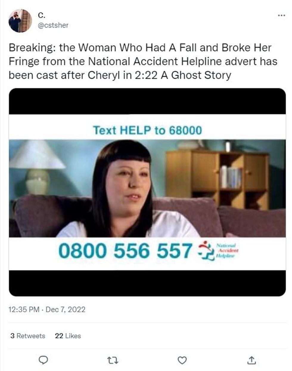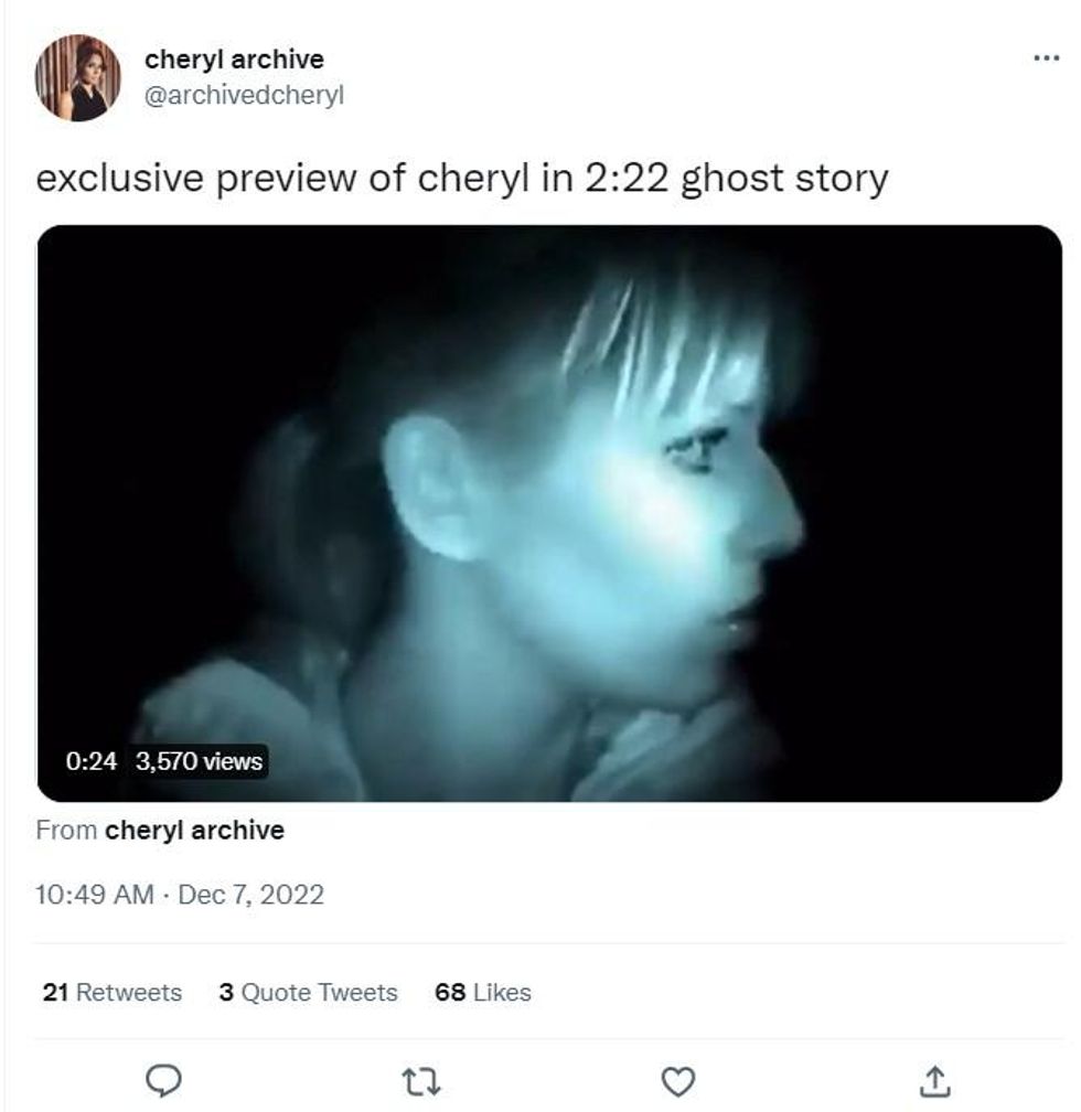 \u201cCheryl when the ghost appears in 2:22 A Ghost Story\u201d— Meena Jutla\u2019s Toyboy \ud83c\udf84 (@Meena Jutla\u2019s Toyboy \ud83c\udf84) 1670417063