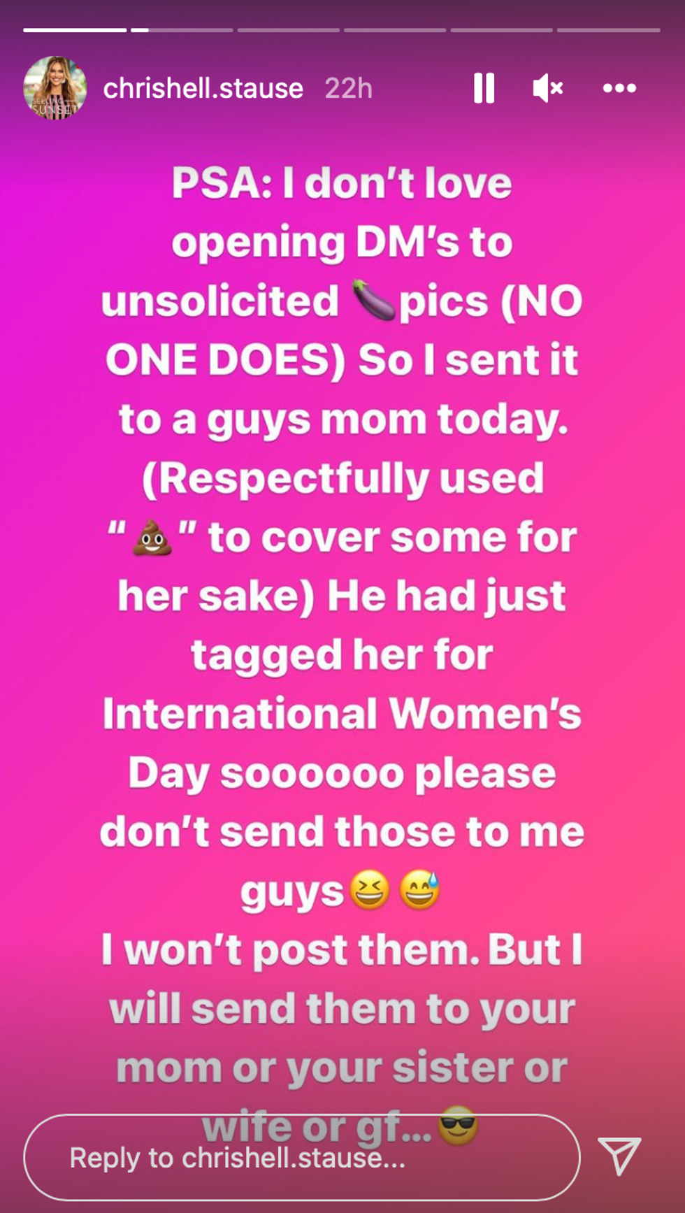 "PSA: I don't love opening DM's to unsolicited [eggplant emoji] pics (NO ONE DOES)," she began her post on her Instagram Story. "So I sent it to a guy's mom today."