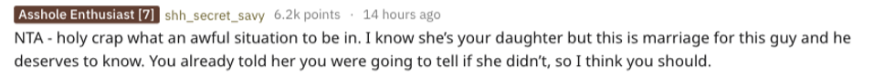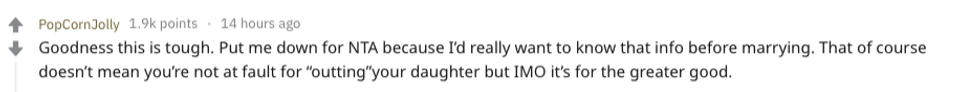 Although the internet was conflicted, responses generally aired on the side of the father. People understood why he felt like he would need to tell his daughter's partner.