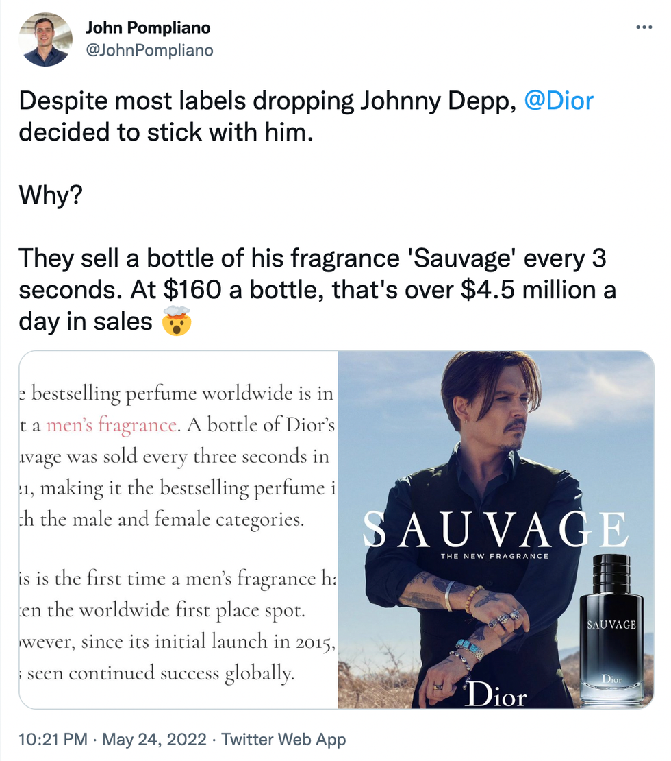 “Why? They sell a bottle of his fragrance 'Sauvage' every 3 seconds. At $160 a bottle, that's over $4.5 million a day in sales.”
