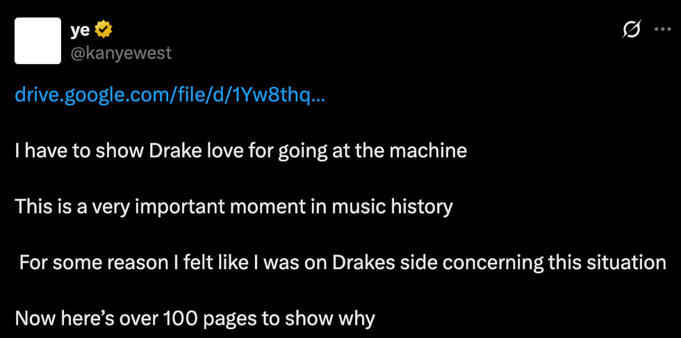 In a post on X, which can be viewed here, Ye, who has faced his own controversies in recent months, uploaded a link to a Google Drive detailing the suit which can be viewed here, alongside a one-minute video sharing his views that Kendrick Lamar isn't the problem, but rather, the music industry itself pitting artists against each other.
