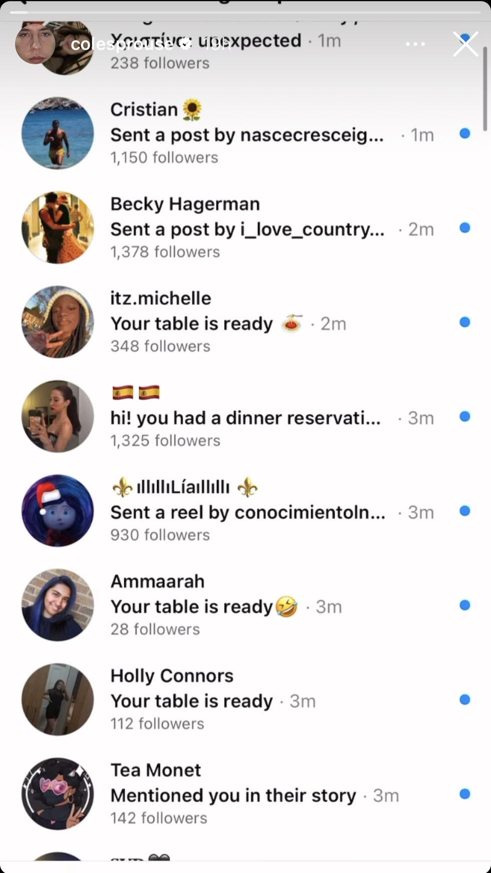 Meanwhile, Cole has similarly been swamped with messages as he shared a little peek at his Instagram direct messages with a 42-second video which are all from fans reminding him of his character's reservation.