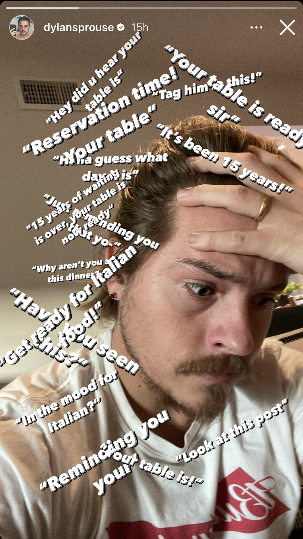 Well, Dylan took to his Instagram Stories to share a selfie of himself with his head in his hand, looking a little overwhelmed as he added the remarks he had been inundated with about the dinner reservation.