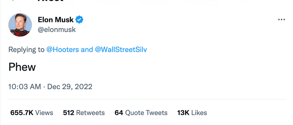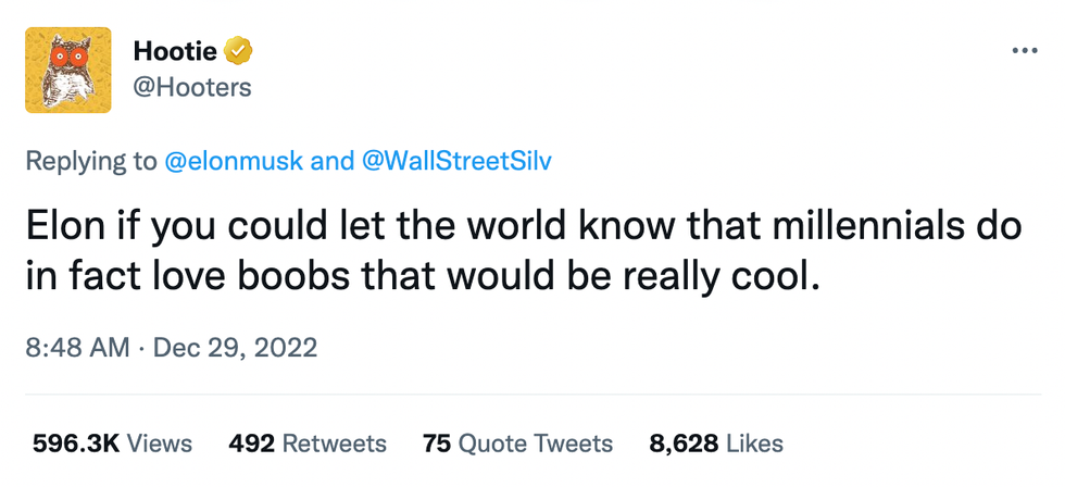 “Elon if you could let the world know that millennials do in fact love boobs that would be really cool,” Hooters tweeted.