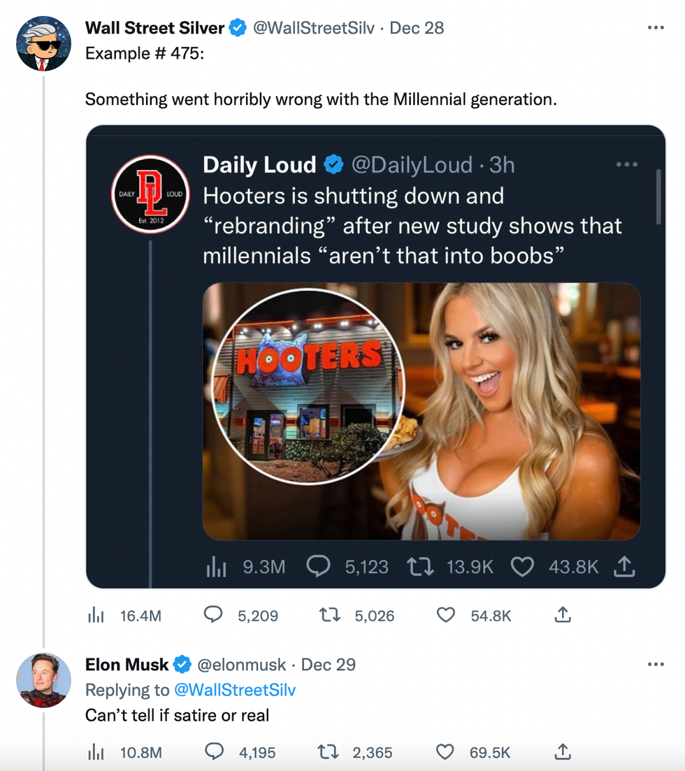 It’s not always easy to tell what information is real or fake online, so when Elon Musk came across a clickbaity article that claimed Hooters was shutting down, he had to inquire.