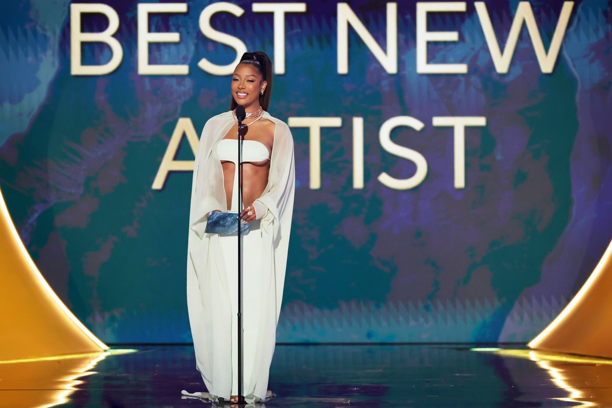 In a resurfaced clip from when Victoria Monet won Best New Artist, she can be seen giving her speech on the stage, while a giant sign flashes at her from the other side of the room.