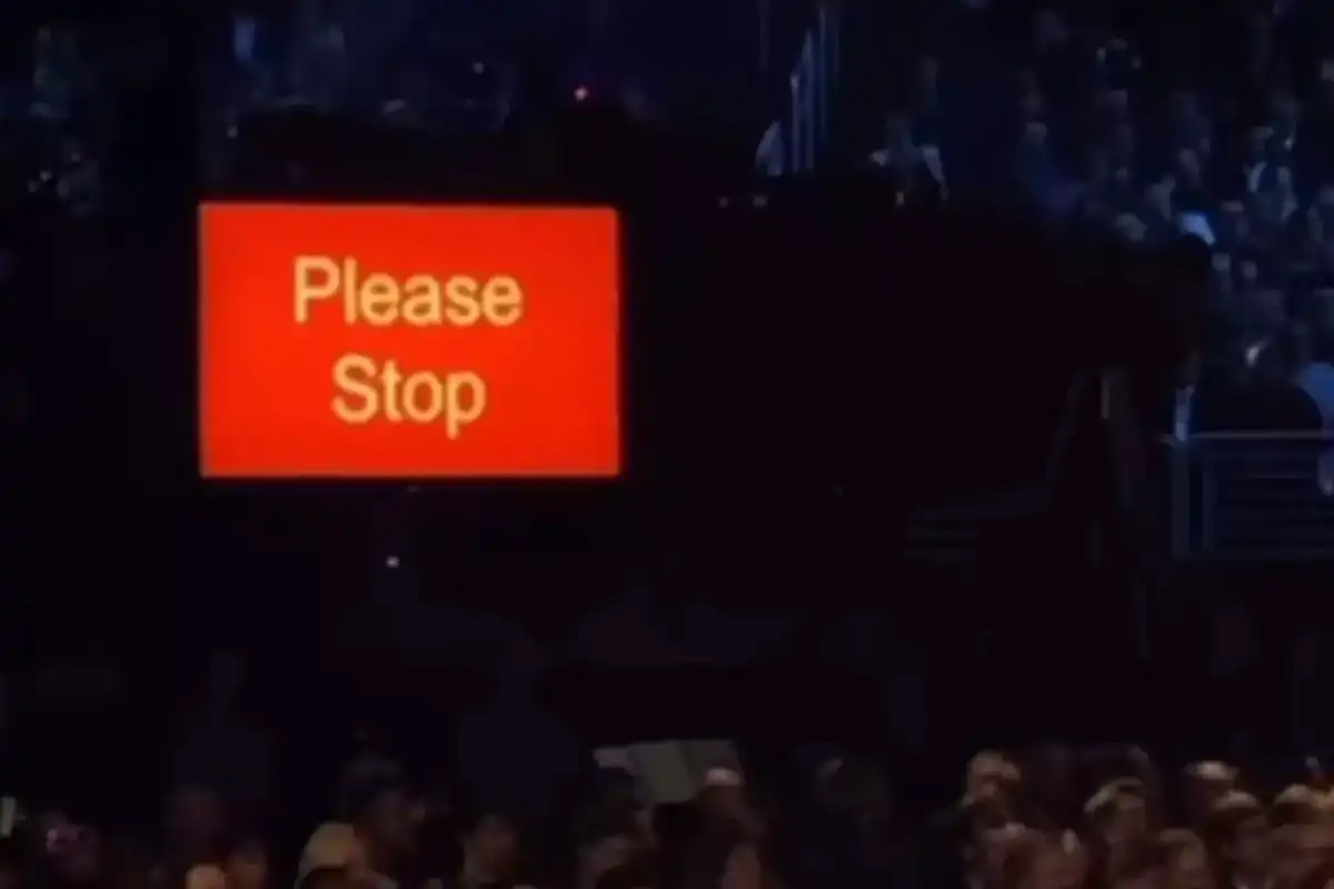 "Please stop", a giant red and yellow sign reads at the back of the audience.