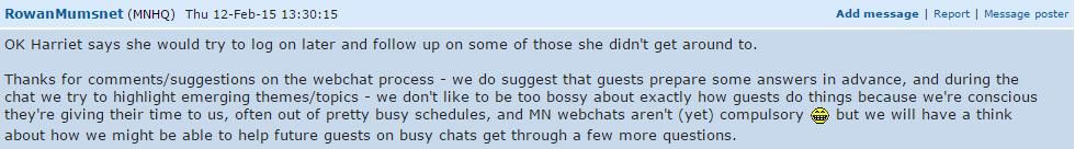 And so on... Harman eventually relented, with a moderator saying she would try and log on later to get through more queries.