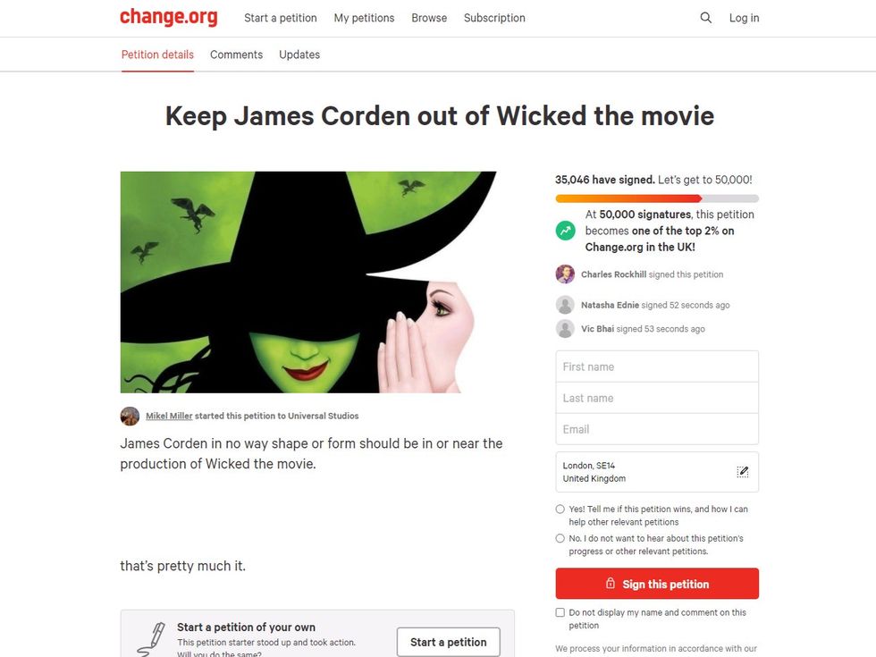 The petition titled: “Keep James Corden out of Wicked the movie,” has already amassed over 50,000 signatures since it was created by Mikel Miller three days ago.