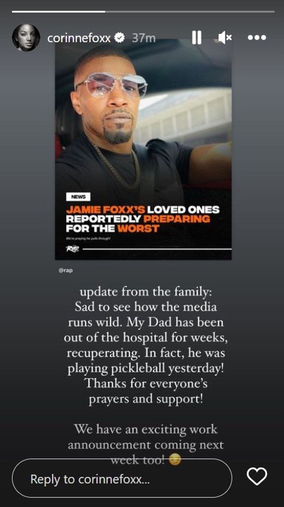 However, Foxx's daughter Corinne Fox has since taken to her Instagram Stories to address the rumours, as she shared one of the reports that said the family was "preparing for the worst" and wrote: "Sad to see how the media runs wild."