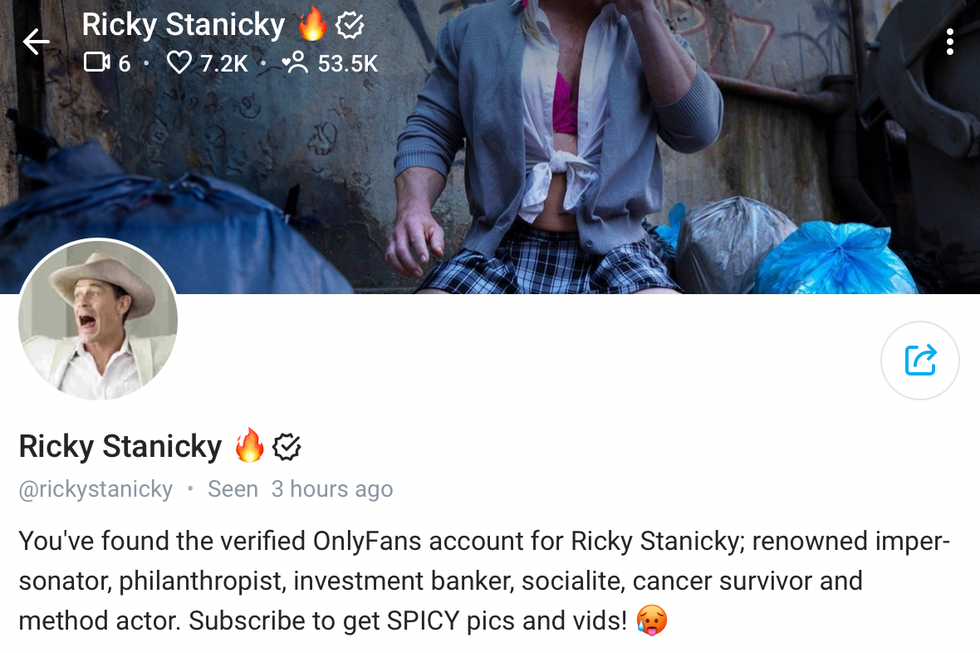 The bio reads: "You’ve found the verified OnlyFans account for Ricky Stanicky; renowned impersonator, philanthropist, investment banker, socialite, cancer survivor and method actor. Subscribe to get SPICY pics and vids."