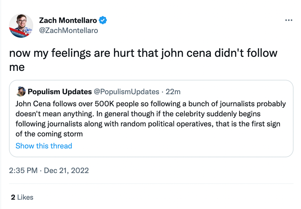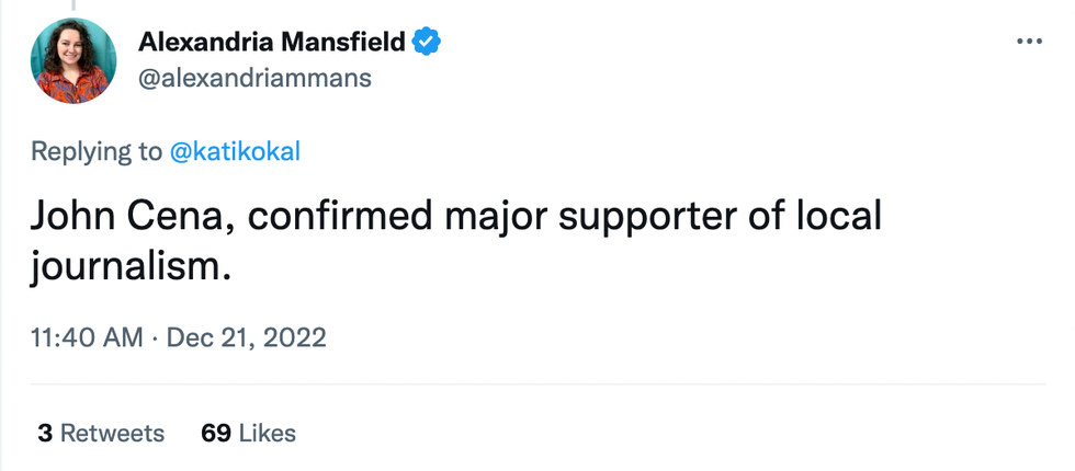 Of the 500k+ people Cena follows, many of them appear to be journalists who write for publications across the country both big and small.