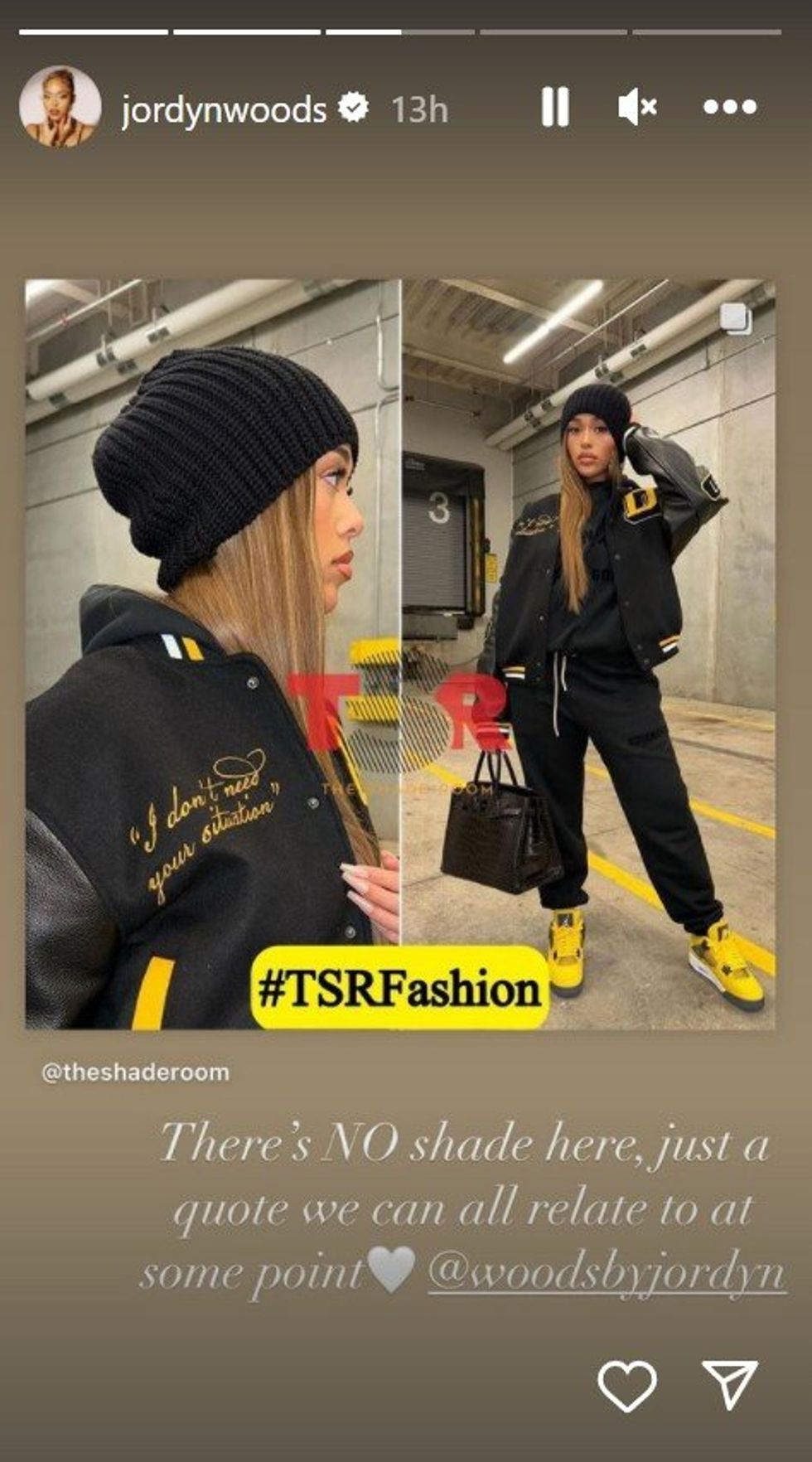 Jordyn Woods shut down rumours that her recent outfit was throwing shade at Khloe Kardashian.