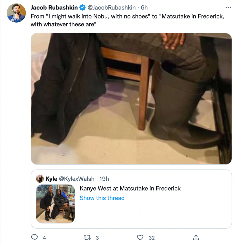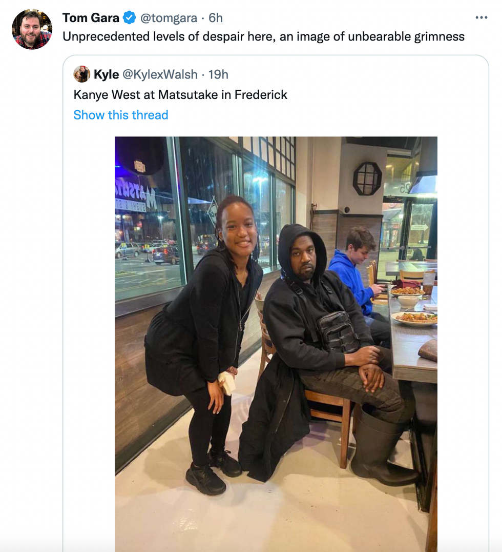 \u201cKanye West at Matsutake in Frederick\u201d— Kyle (@Kyle) 1669683405