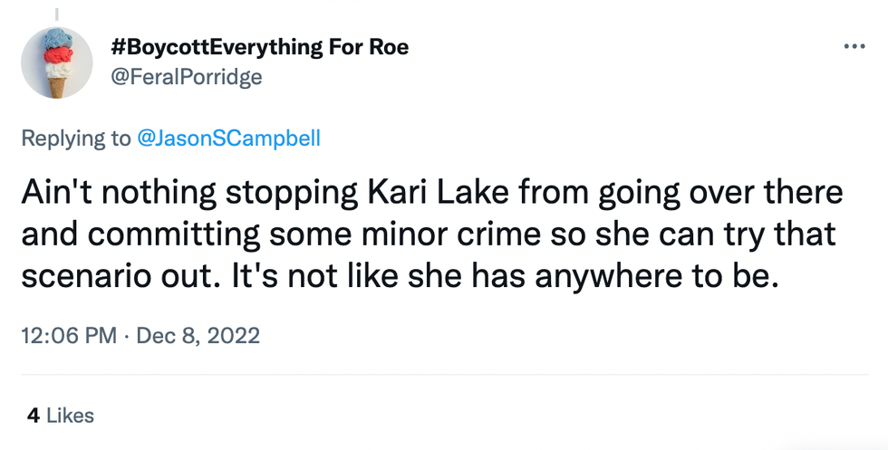 \u201cKari Lake says Brittney Griner should've refused release: "If you told me, we're going to release you for this guy, I would maybe say, 'you know what? Let me stay a little bit longer, keep working on that negotiation. Let's see if we can find something a little bit more level'"\u201d— Jason Campbell (@Jason Campbell) 1670516112