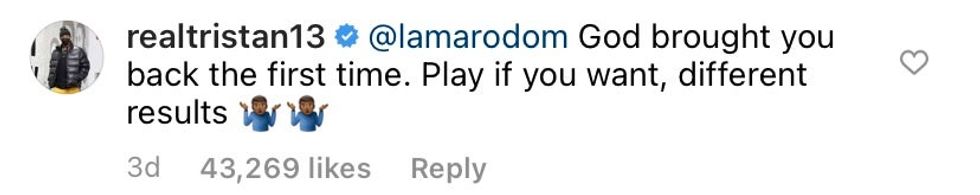 But then, Tristan opted to posted another, separate, comment, tagging Lamar: “@lamarodom God brought you back the first time. Play if you want, different results.”